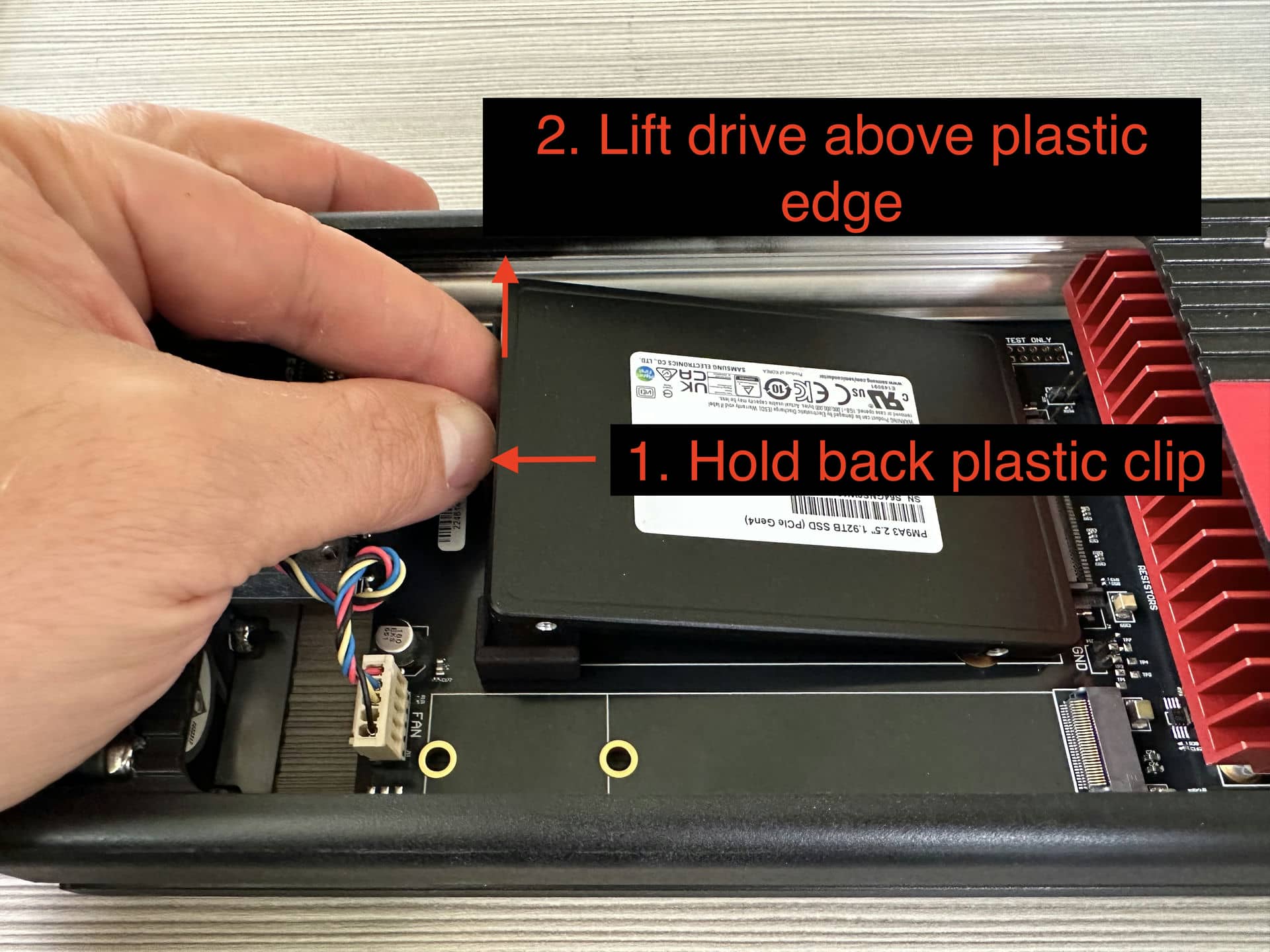 Carefully remove the SSD from the BX-4KU module by pushing back on the plastic drive clip while gently pulling up on the end of the drive that is held down by the clip (opposite end where the drive is connected). Once the drive has cleared the plastic clip, pull it away from the PCIe connector to disconnect.