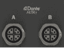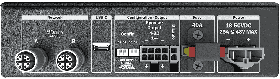 RideAmp provides a total of two M12 X-Coded network ports. These ports are devoted to a 4x0 (4 inputs, 0 outputs) network audio interface that supports the AES67 and Dante standards. When using Dante, these ports also pass back important status information via the network link to a RidePlayer for monitoring amplifier health.