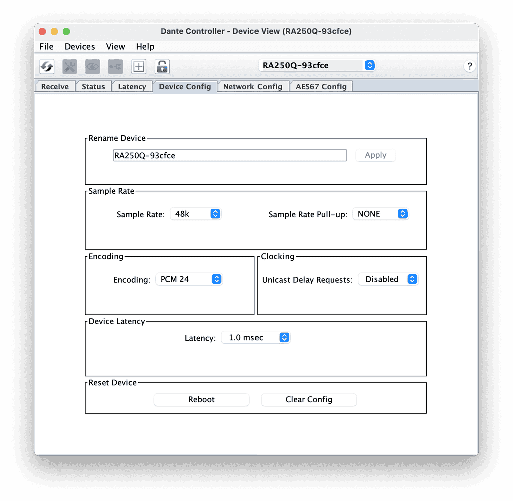 Using Dante Controller, you will give your RideAmp units a unique name in the Device Config window. This name will be used by the RidePlayer to discover the unit on the Dante network, so it is important to keep track of the device names.