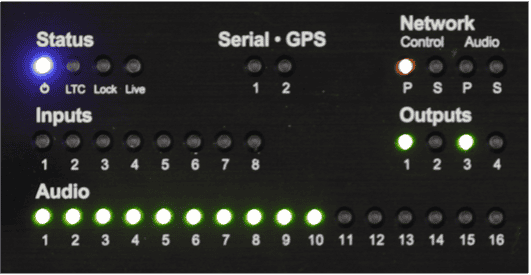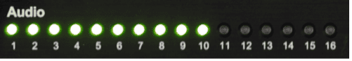 These indicators display the status of all 16 audio outputs. This includes playback activity and audio mute status.