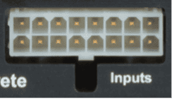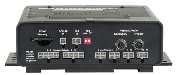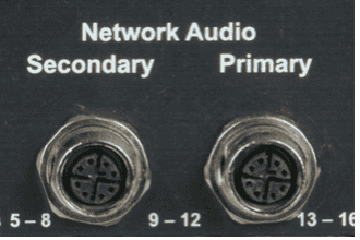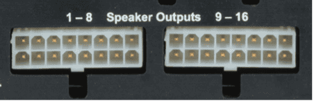 This is where you connect speakers being driven from the built-in amplifier outputs. These connectors provide access to all 16 of the 25W speaker outputs. Keep in mind that these outputs can be software-configured for bridged operation and wired differently to achieve up to 8 individual 50W speaker outputs.