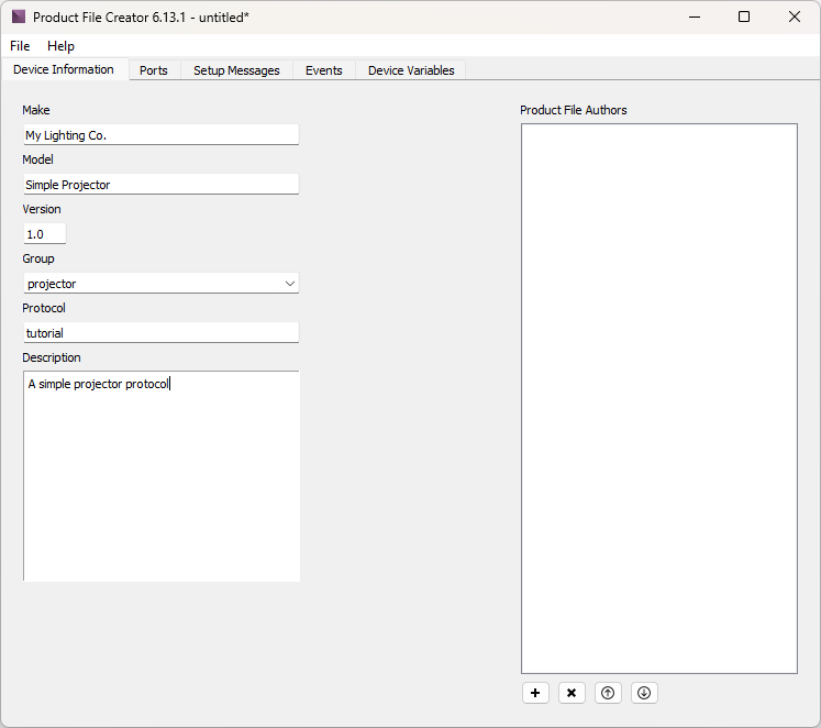 Select “projector” from the Group dropdown menu so that the device will be classified as a projector. You can create different protocols for the same device if you like, but for this example simply enter “tutorial” for the Protocol field.