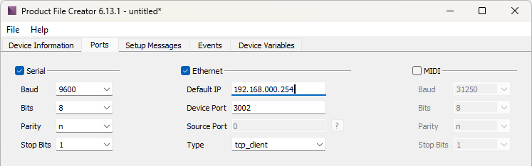 There are also options for the Ethernet port. Here you can fill in the various port fields according to the hardware specifications of your device. For our purposes, fill in the Default IP with “192.168.0.254”, the Device Port as “3002”, and the Type as “tcp_client”. We choose “tcp_client” because our Show Controller will be initiating the TCP connection. Had we chosen “tcp_server”, we would be indicating that the external device would have to initiate the connection. The projector does not use MIDI so leave that option unchecked.