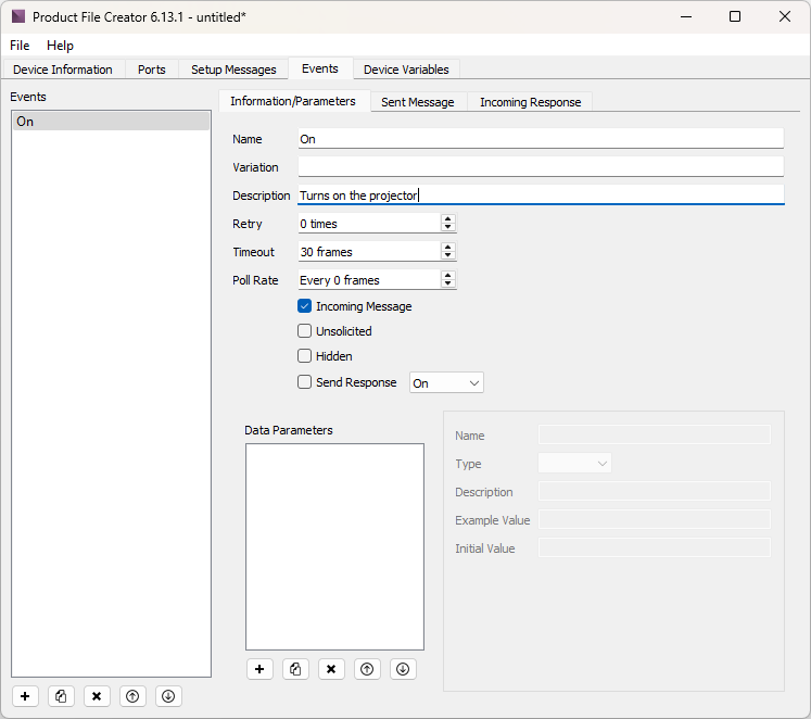 Click on the Add Event button and type “On” for the Name of the Event. Any description you add will be used in WinScriptLive alongside the Event name. According to Christie’s documentation, the Power On command can send an acknowledgement of success. This would be useful. Click the “Incoming Message” check box so that we can set up a filter for such a response.