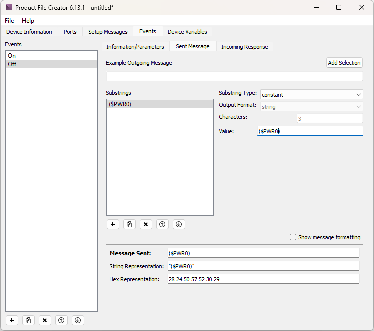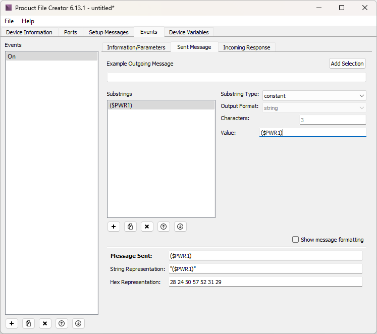 We will make a message from one substring of type “constant”. Click on the Add Substring button, select “constant” as the type of substring to add, and enter “($PWR1)” in the box labeled “Value”.