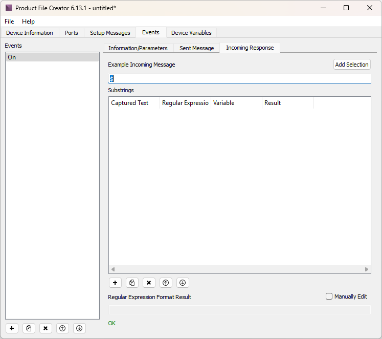 There are two main ways to add to substrings on this tab. You can either: 1) highlight parts of an example Incoming Response and specify what role those parts play in the final message; or 2) directly add substrings to the final message without using an example message. Luckily for us, the command to turn on our projector is relatively simple, so we will use the second method.