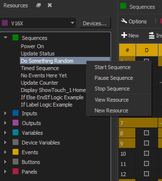 Right-click on any sequence to Start (Play), Pause, or Stop.