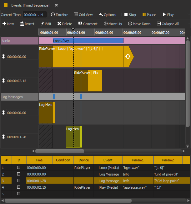 Use the Stop, Pause, and Play buttons to control timed sequences. The small white triangle and black dashed-line tracks the current sequence time.
