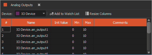 Analog outputs are displayed in a pre-populated grid view based on the selected device.