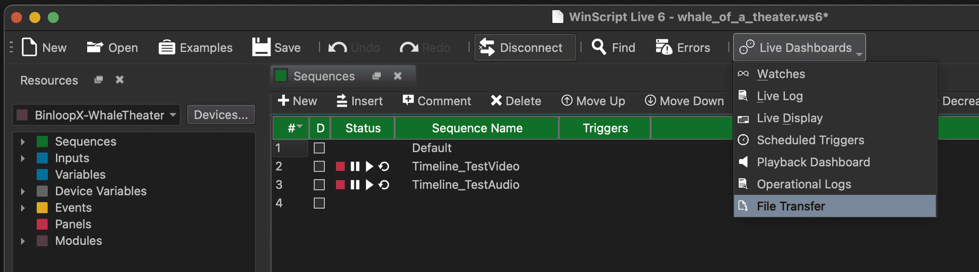View the File Transfer screen by clicking the Live Dashboards->File Transfer in the WinScript menu bar.