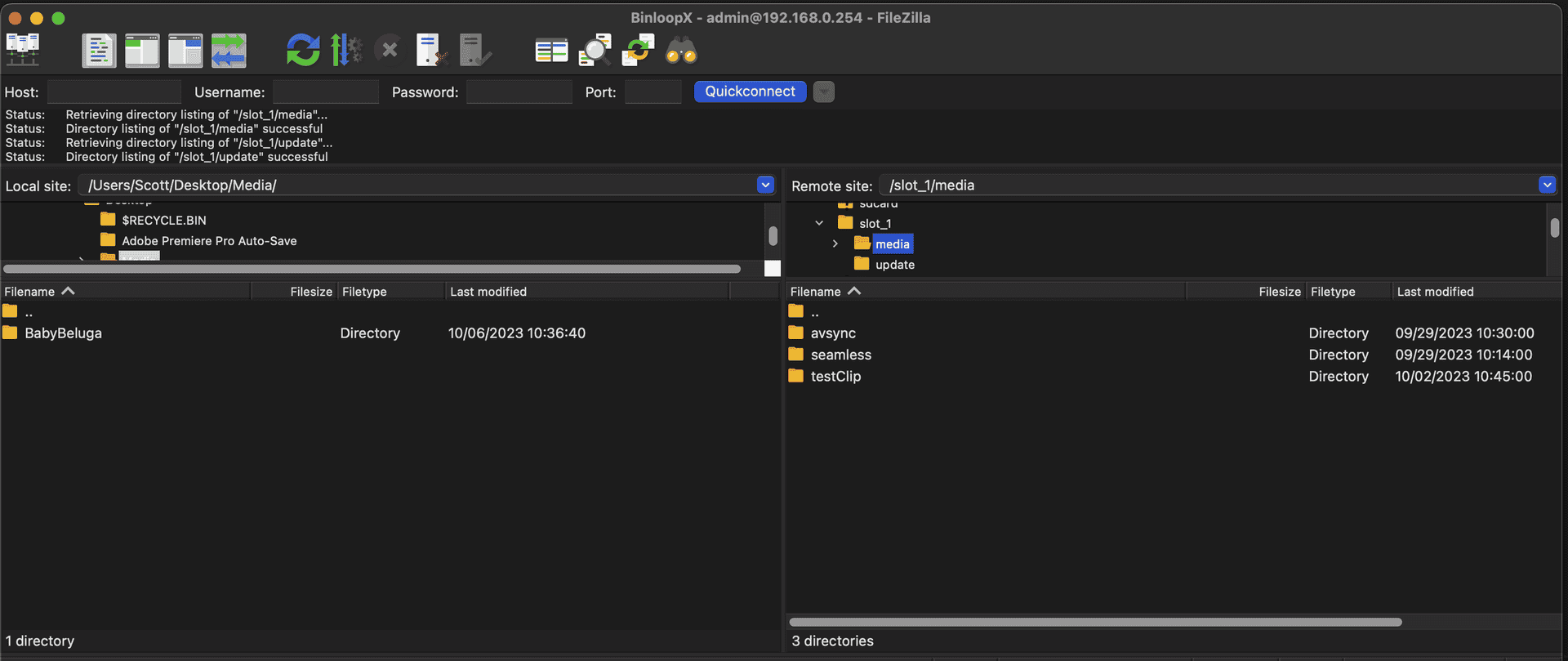Once FileZilla is installed and you're connected to the BinloopX on the network, follow these instructions to load new content to the BX-4KU: