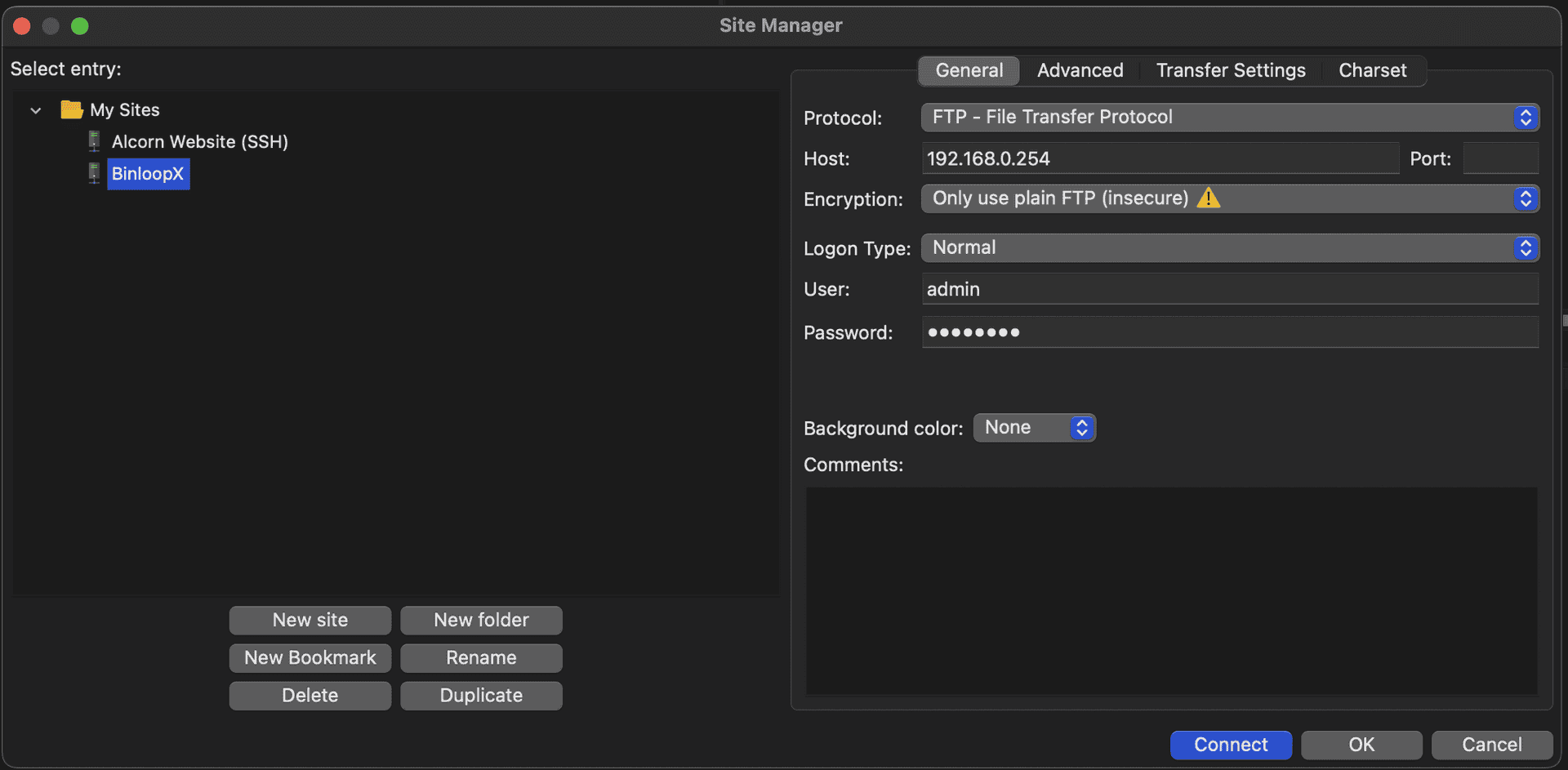 FileZilla Site Settings Protocol FTP - File Transfer Protocol Host Enter the IP address of the BinloopX BX-CON1 or BX-4KU Media Port (192.168.0.254 by default) Encryption Only use plain FTP Logon Type Normal User Enter FTP Username (admin by default) Password Enter FTP Password (password by default)