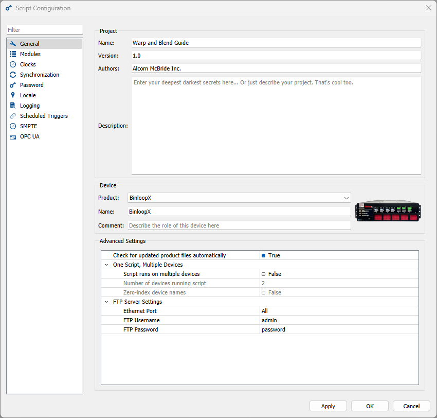 2. In the Script Configuration dialog box, in the General section, in the Project section, enter your project details (Name, Version, Authors, and Description).