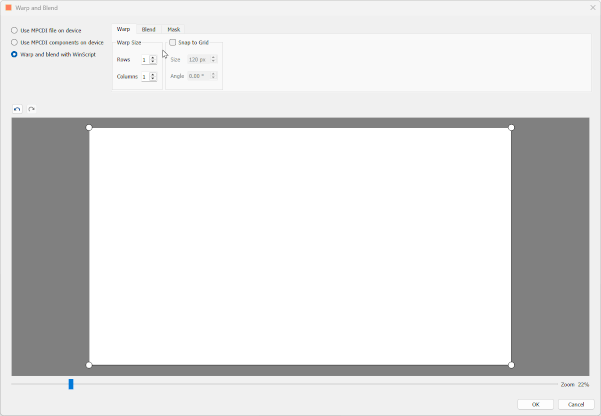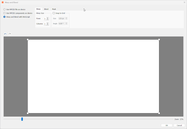Clicking the OK button in the bottom right of the menu will save all your Warp and Blend changes (temporarily, you will still need to save the script itself). Clicking the Cancel button will discard all changes since the last time the OK button was clicked.