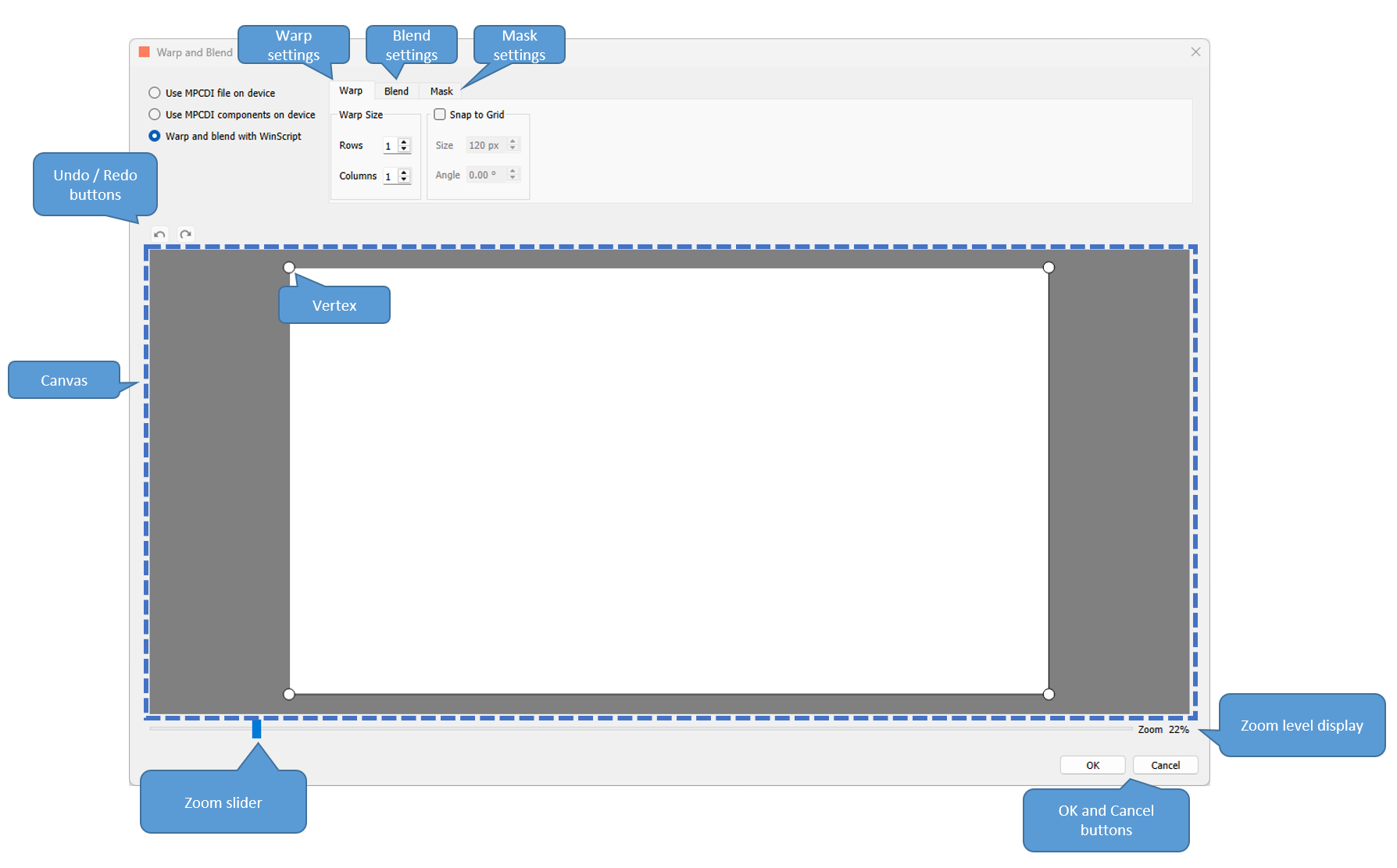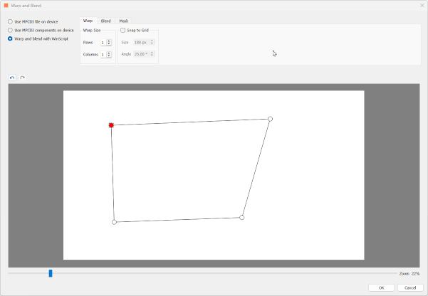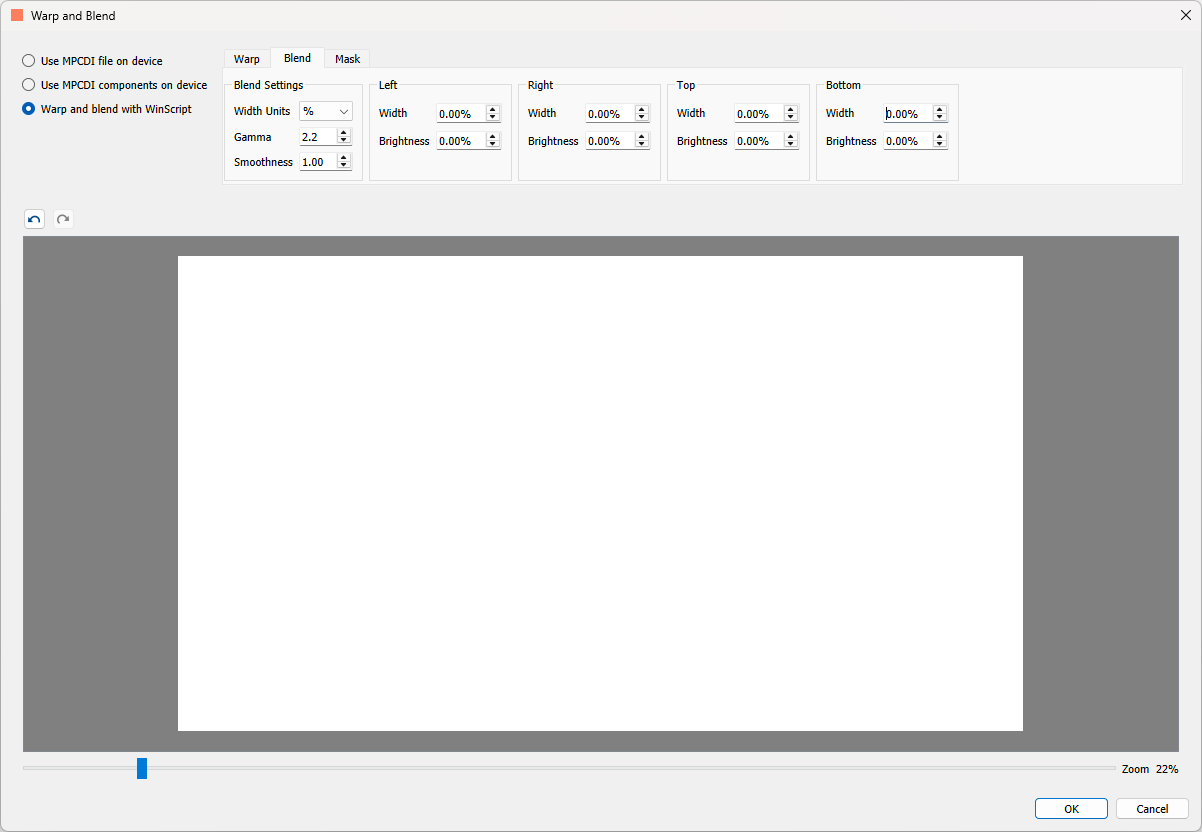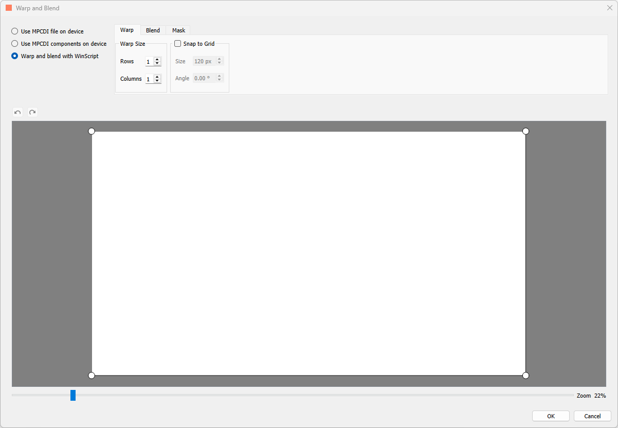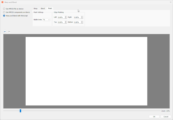 The slider below the Canvas can zoom into and out of the view to enable more granular editing of the Warp, Blend, or Mask. The Zoom % is displayed to the right of the slider. When you are zoomed in, scroll bars appear along the right and bottom of the Canvas. The default zoom is 22 %, the maximum zoom out is 1%, and the maximum zoom in is 200 %.