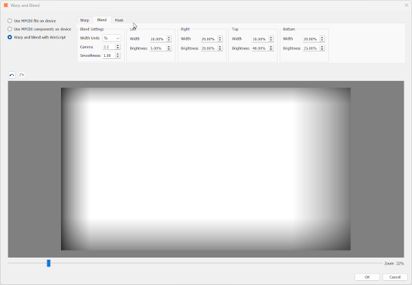 • Blend settings: gamma, smoothness, and left, right, top and bottom settings for blend