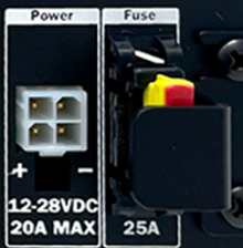 RideAmp is designed to accept either a 12 VDC or 24 VDC power source. An inline automotive blade fuse (25 A/80 V) is accessible on the RideAmp side panel. Voltage levels are electronically monitored, and low voltage conditions can be reported back via the network audio connection to RidePlayer.