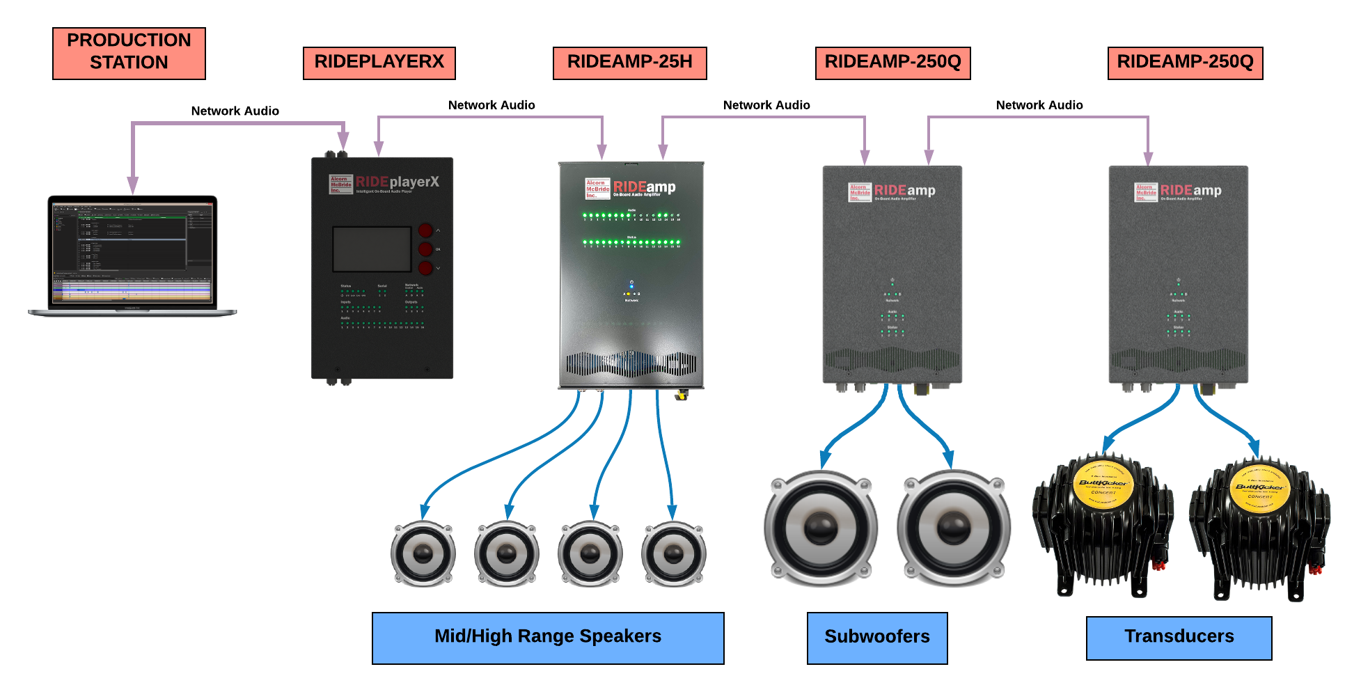 Content production and workflow are also critical to building great rides. Using the built-in 16x16 AES67/Dante interface, media designers can patch in their source (i.e. ProTools, Audition, etc.) to preview content on the actual on-board audio system without having to load a single file. Once satisfied with the mix, WAV files can be easily exported to the product via network for normal operation. These network audio inputs are also useful for taking in audio outputs from other devices like on-board gaming engines and paging stations so that they can be incorporated into the audio outputs of RidePlayerX.