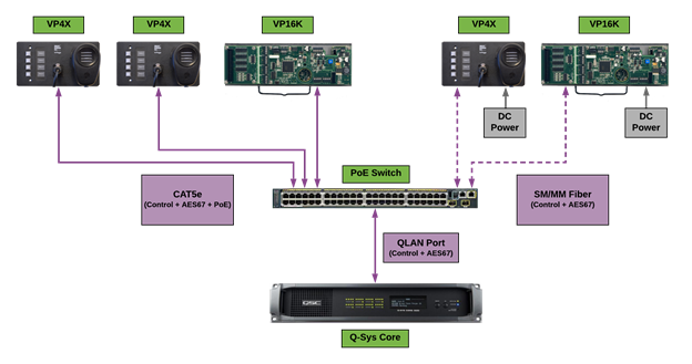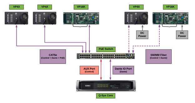 One important thing to understand is that each V-Page or V-Com has two network interfaces that are switched into a single physical port; one for Control and the other for Network Audio (Dante or AES67). Also, Q-SYS Cores handle AES67 and Dante very differently. AES67 can be utilized on the same network as Q-LAN, while Dante requires a dedicated Dante IO card to be installed within the Q-SYS Core.