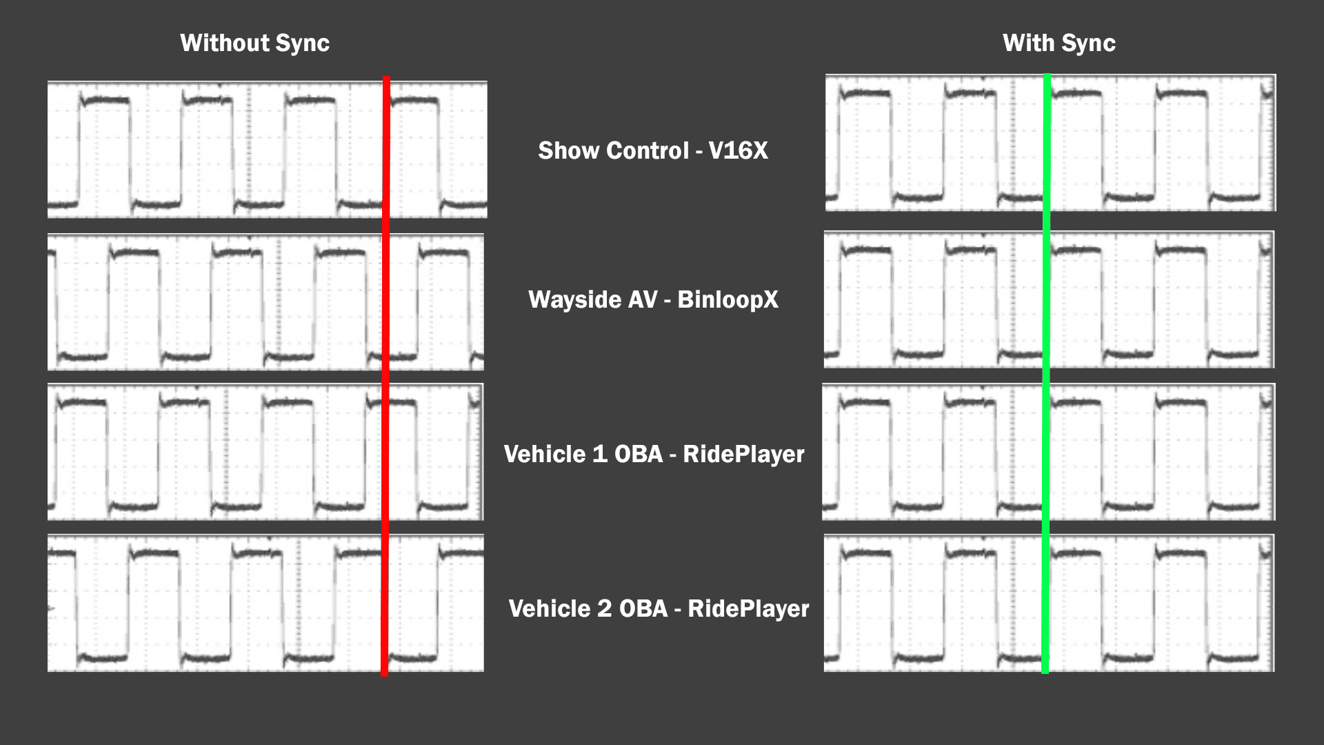 Precise synchronization between show systems, especially those involving ride vehicles, is one of the biggest challenges faced in themed entertainment applications. Doing this properly involves achieving two critical conditions: