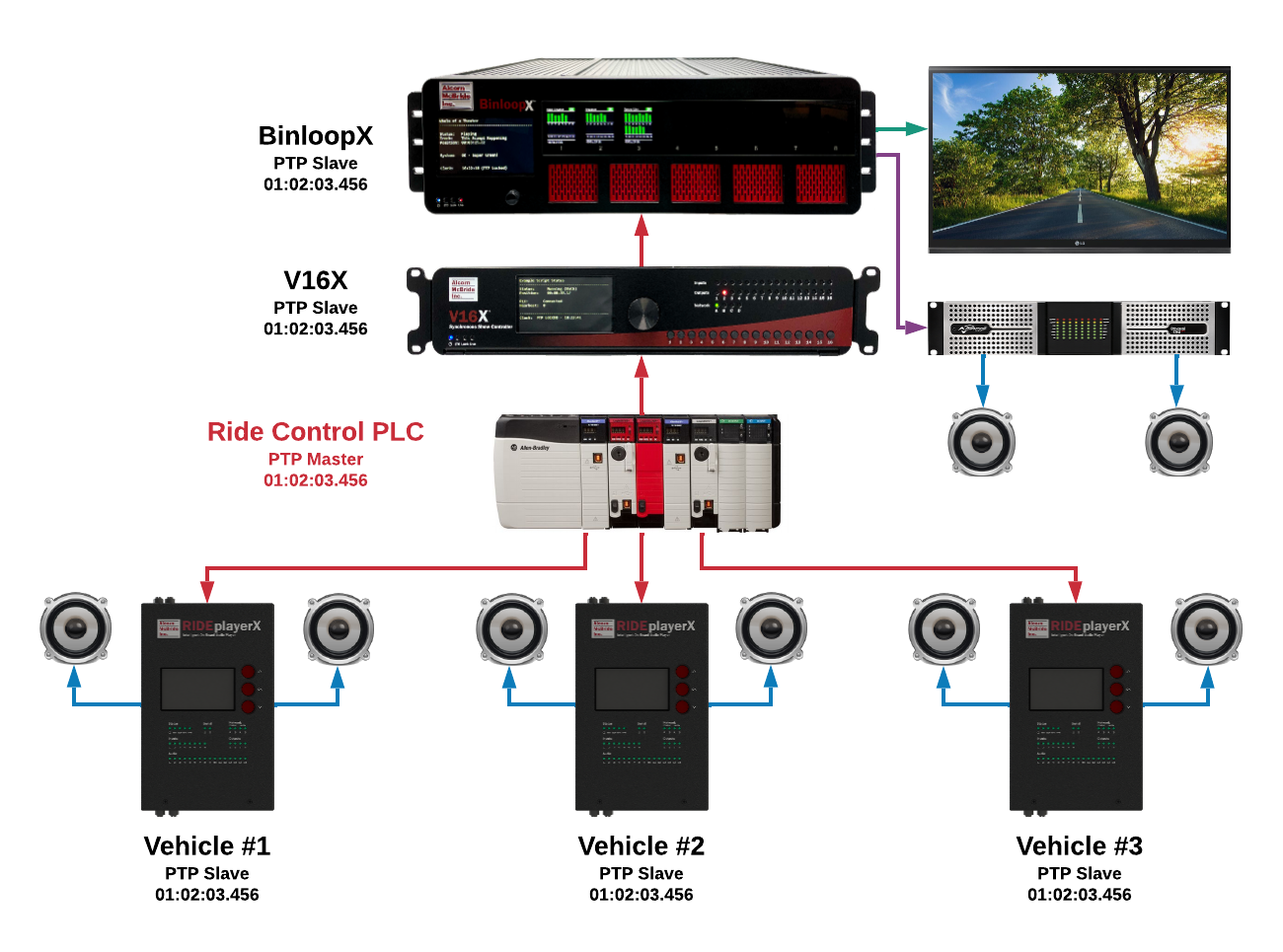 To answer that question with a pretty picture, here is a representation of a typical dark ride system that uses the Ride Control PLC as the PTP clock master for the entire attraction. In this example, the V16X, BinloopX, and RidePlayerX would all be configured to lock directly to the PLC's master PTP clock to ensure perfect synchronization for all show systems throughout the attraction.