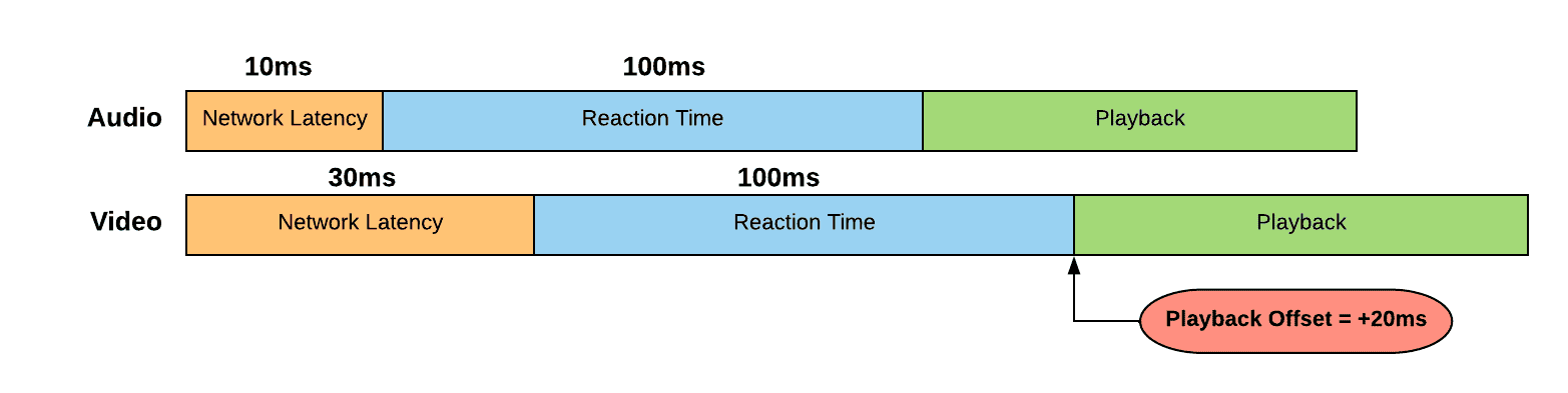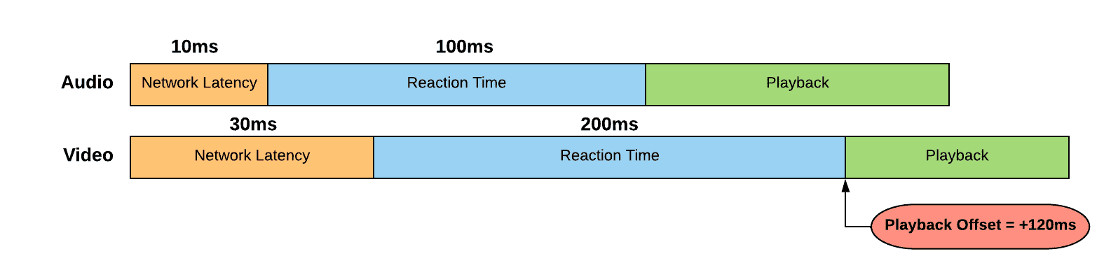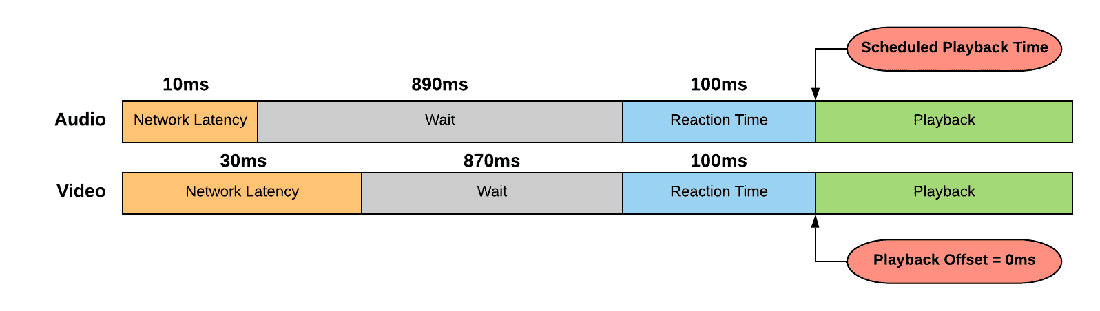Specialized AV playback equipment can greatly improve this situation by offering consistent reaction time. Let's say that this equipment guarantees that playback will begin exactly 100ms after a command is received. The idea is that you send the same command to two different devices and they both start after exactly 100ms. Viola! They are synchronized! The catch is that those commands must be received by both devices at exactly the same time for this concept to work. This is quite challenging, especially via wireless networks where packet latency can easily exceed 100ms.