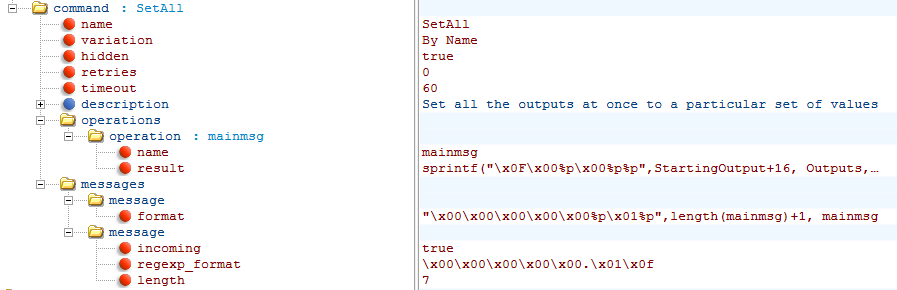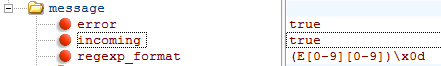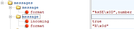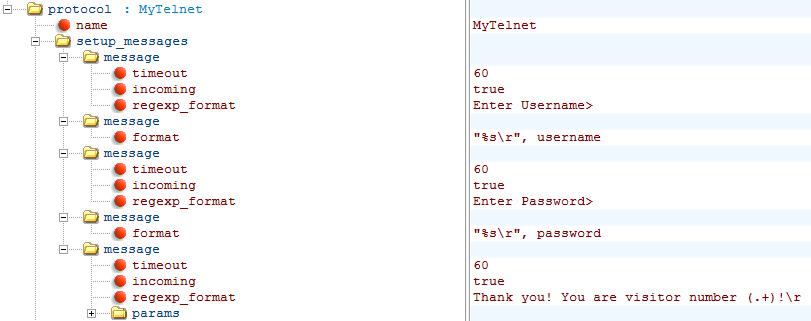 Each "message" above specifies either an incoming or outgoing message. For incoming messages, "timeout" and "regexp_format" are valid parameters. For outgoing messages, "format" is the only valid parameter. Operations (such as +, -, left(), right(), etc) may be included in the "format" field directly.