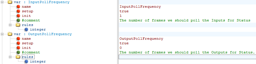 Aside from the special name of "PollOutputs", this command also has the special property "poll." The value for this attribute is the number of frames that the output's state can be polled. If this value is zero, the output's state will only be requested when after a change of state command (ie: "on" or "off" command). This value can also be a variable. In this example, we'll use the variable we created called "OutputPollFrequency."