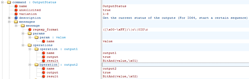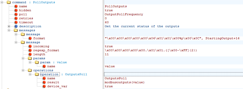 Alternatively, any math operation (such as BitAnd()) may be used instead of the "modbusoutputs()". To finally store the value in an individual output, the parameter can have the attribute "output" to note that this is the value that should be stored in the WinScriptLive output. This method is used in the AMI_io64 product file (section shown below). In the IO64 product file, the responses are separate 'unsolicited messages' rather than a direct response to the "PollOutputs" command.