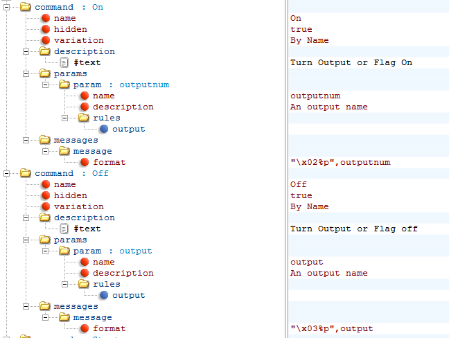 You can directly use the commands with the exact name "On" or "Off" to set individual outputs one at a time. This method requires that the outputs are listed by under the "hardware" section (see Alternative Method: Number of Inputs and Outputs). This method is not recommended if there is a way to set all the outputs state at one time. This method can NOT be used if there is a "SetAll" command in place. The "SetAll" method is usually more efficient and will result in more accurate timing. The IO64 product file using this method is shown below.