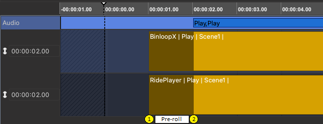 The example below illustrates how this concept is used to synchronize sequences between a V16X, a BinloopX, and a RidePlayer. At position (1) within the V16X sequence, commands are transmitted to both the RidePlayer and BinloopX. These commands schedule sequence playback to begin at position (2). The scheduled time is compared to a shared clock source (such as PTP, NTP, GPS, etc) which ensures playback starts precisely at the correct moment.