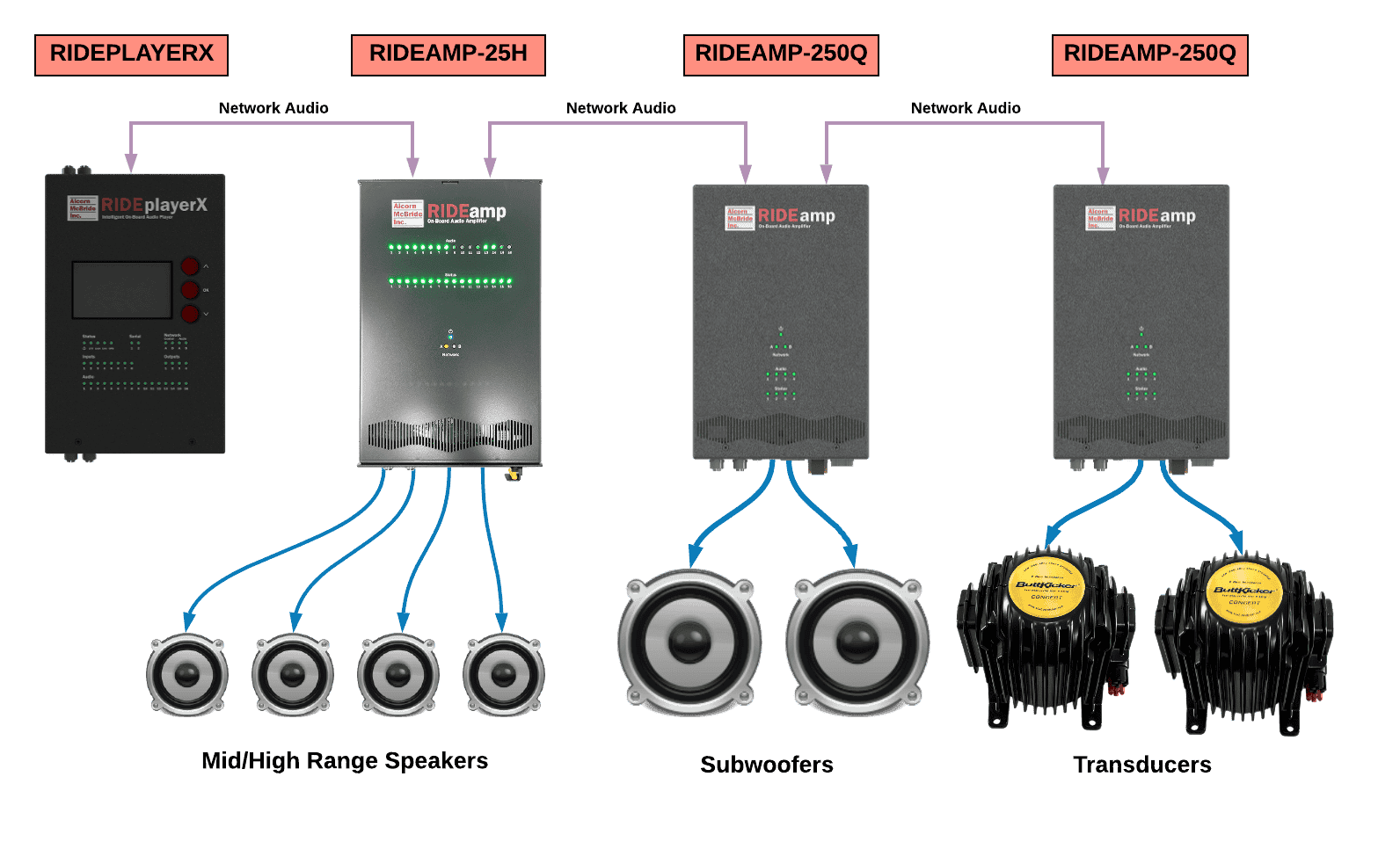 When one or more RideAmp units are paired with an Alcorn McBride RidePlayer, you have a complete solution that offers perfectly synchronized audio, DSP, high-power audio amplification, and comprehensive status monitoring of the entire on-board audio system.
