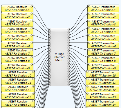 Your Q-SYS design requires AES67 Receivers and AES67 Transmitters to run digital audio from the V-Com through your design and back to the V-Com.
