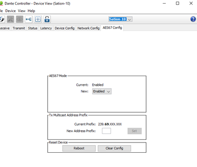 In the AES67 Mode section, in the New field select Enabled, then in the Reset Device section, click the Reboot button.