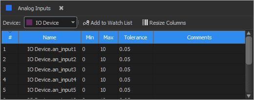Analog inputs are displayed in a pre-populated grid view based on the selected device.