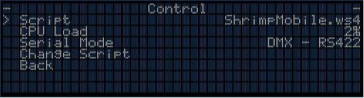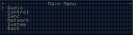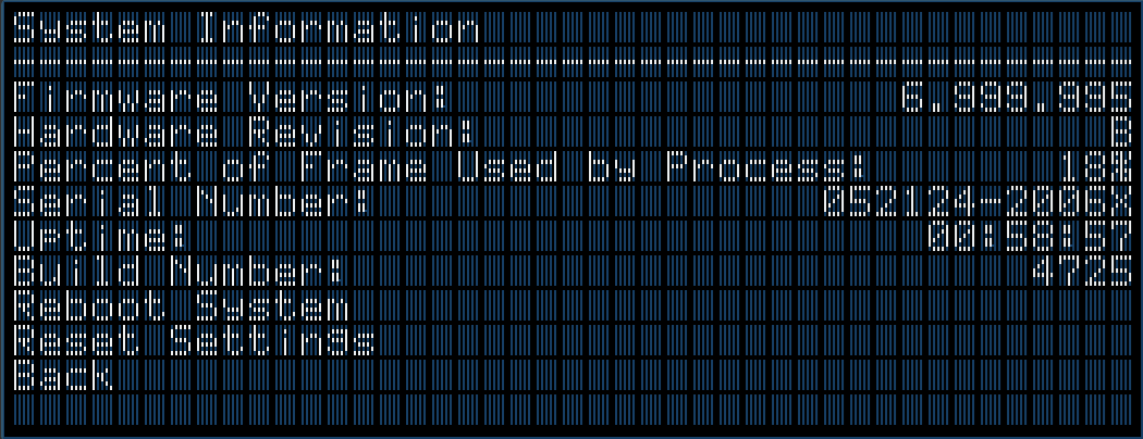 The top panel of RidePlayer features an 8-line by 42-character OLED status display. This display is primarily used to share application-specific information (i.e. “Location: Scene 2”) from the show control script. However, this display also offers a full menu system that can be accessed using the navigation buttons located adjacent to the display