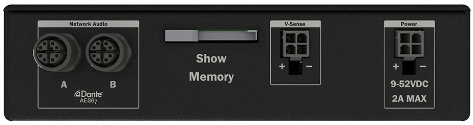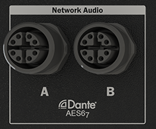 These are also standard M12 X-Coded Ethernet connectors. They provide access to the 16x16 network audio interface that supports the AES67 and Dante standards. There are two connectors (A and B) with an integrated internal switch to support daisy-chaining with network audio devices like RideAmps as well as support easy interfacing with a computer running Dante Controller without requiring any external switch hardware.