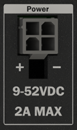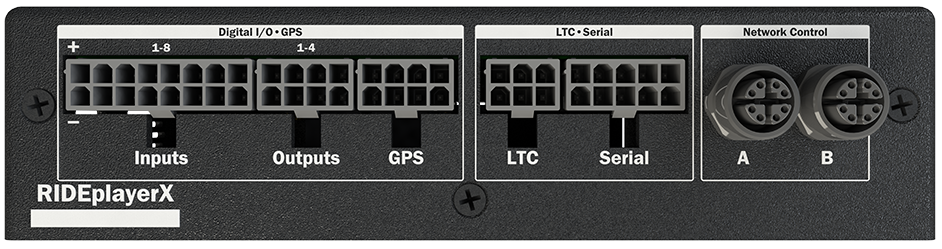 This connector is used to power the RidePlayerX. While this unit will operate with a power source between 9-52VDC, we recommend using a 12, 24, or 48VDC power supply with at least a 2A current rating.
