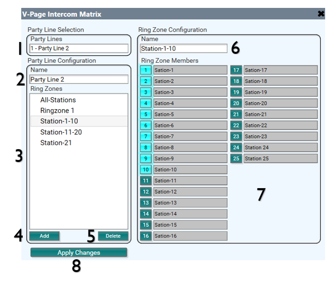 - Ring Zone Members: Assigns the selected stations to the currently selected ring zone. The station(s) that have a number light up will ring when that Ring Zone is called. The list will auto-populate from any station that has been assigned at the station plugin.