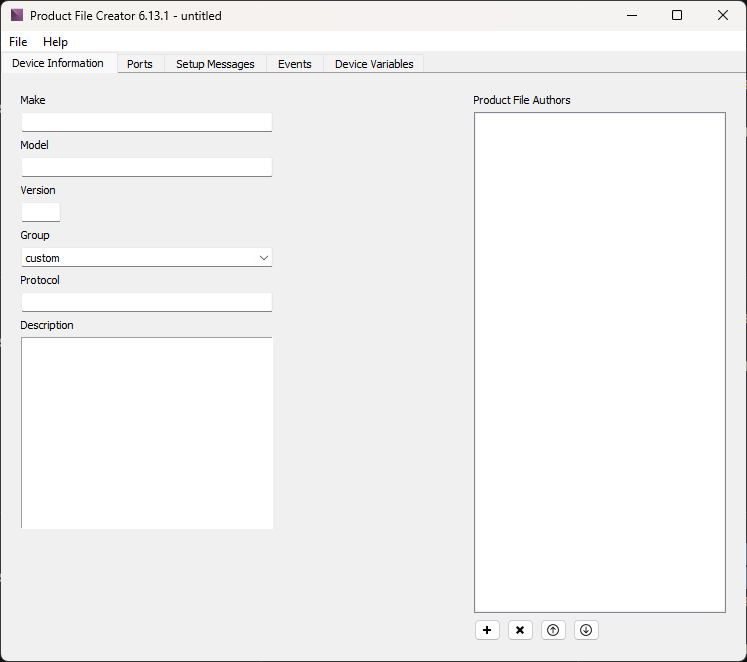 When you first open Product File Creator, you will see the Product File Creator dialog box, open to the Device Information tab. This tab is where you will enter information about the product for which you are making the product file. This info is what WinScript Live will use to identify and differentiate between different product files.