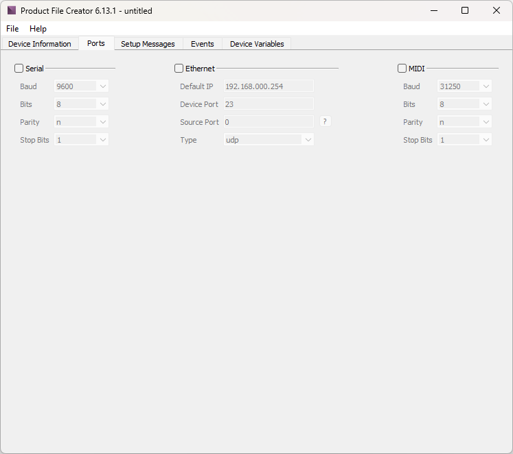 For each port you wish your device to use, check the box next to the port name. Once checked, the additional options for each port will become editable. The ports available for your device to use to communicate are Serial, Ethernet, and MIDI.