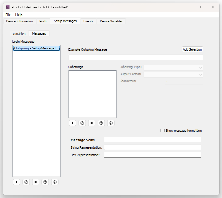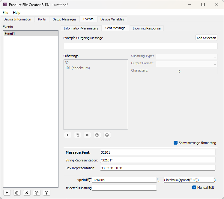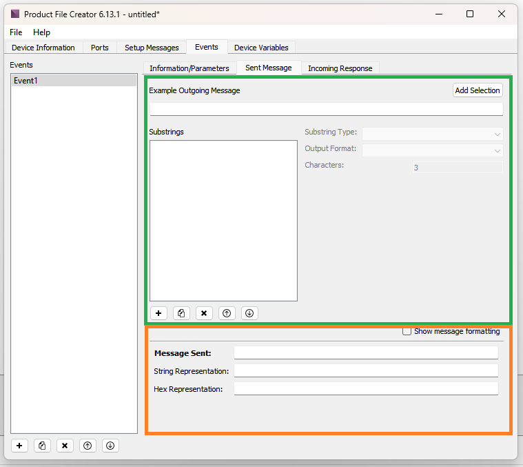 The Sent Message tab is used to define the message that is sent when the event is executed. Some of these messages are complicated combinations of Device Variables, data parameters, and even unprintable characters. For this reason, the Sent Message tab allows you to build a message as a combination of substrings.