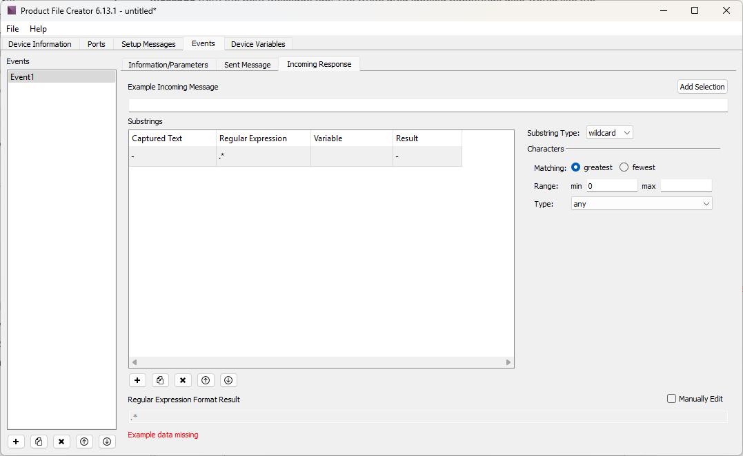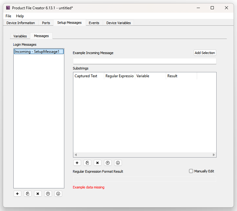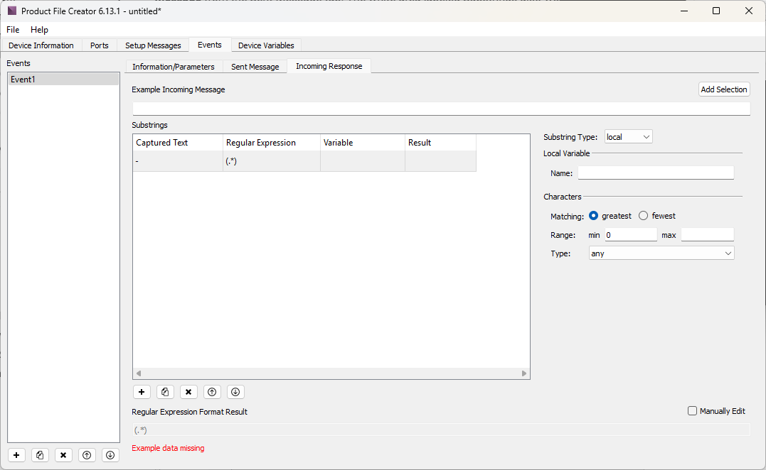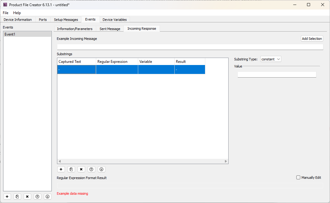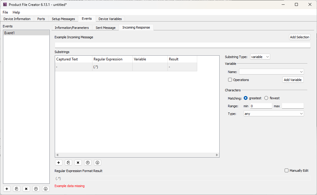 The area at the top near the label Example Incoming Message works like the Example Outgoing Message from the Sent Message tab. The white area labeled Substrings also works like the Substrings section of the Sent Message tab. Each Substring will have a Captured Text, Regular Expression, Variable, and Result. The Subtrings section can be resized for ease of use.