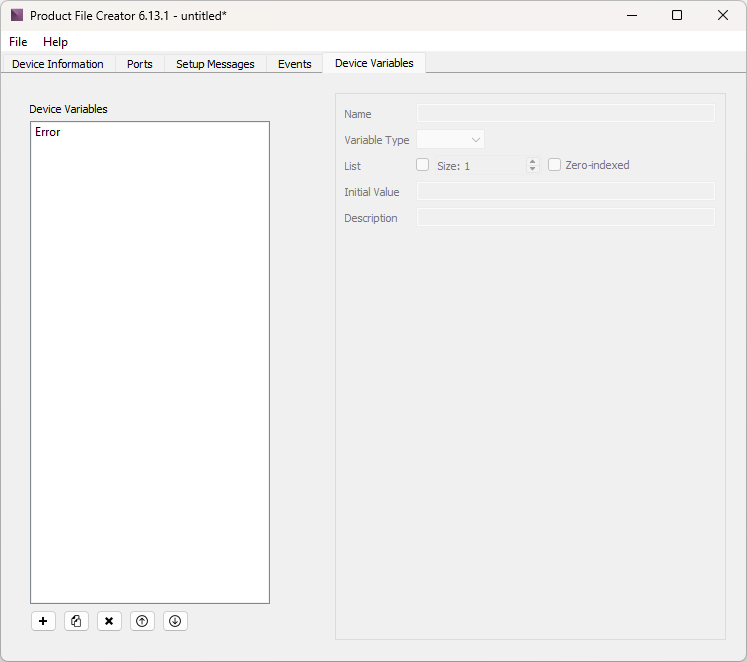 The white area lists all the device variables already defined. Beneath this area are options to Add New Variable (➕), Duplicate Variable (📄), Delete Current Variable (✖️), Move Variable Up (⬆️), and Move Variable Down (⬇️).