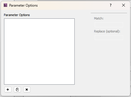 - Option: setting this to option will allow you to define a list of options that the user can select when creating this event. Choosing option will display a new button below the other options. Clicking this button will open the Parameter Options dialog box. This dialog box has a similar to configuration, with an Add New Option (➕), Duplicate Option (📄), and Delete Current Option (✖️). Creating an option here will allow you to name it using the Match field, and populating the Replace (optional) field will allow you to choose a different name to be used by the device behind the scenes.