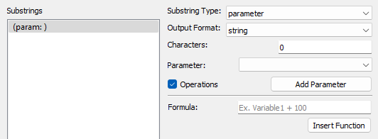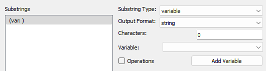 A Variable substring gives options to select a variable from a dropdown, provides a Characters section that works just like in the Wildcard substring described above, has an Add Variable button to create a new variable, and an Operations checkbox. Checking the Operations checkbox will reveal an Operations field, an Insert Function button with functions detailed above, and Result field that shows the resulting operation.