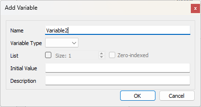 - List: check this box to set this variable to be a list, set the size (default 1), and check the box next to Zero-indexed if you want the list to start at 0 (as opposed to 1)